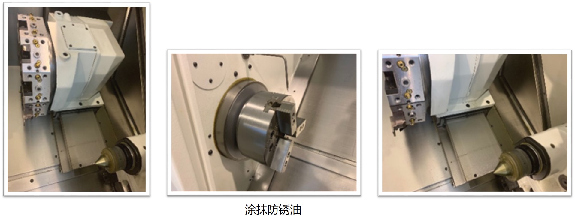 4. 关机后,建议对机床的金属裸露位置,有水或水气较重的部位涂抹防锈油或作防锈处理。特别是移动的导轨面如下图车床的X轴移动导轨面上要涂抹防锈油;