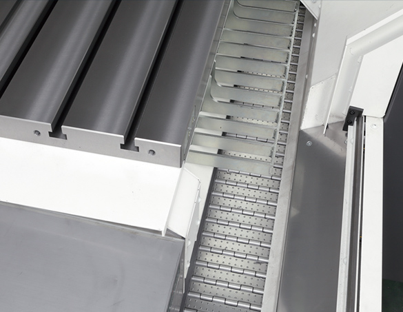 在工作台前后设置宽敞的机内铰链式排屑器。